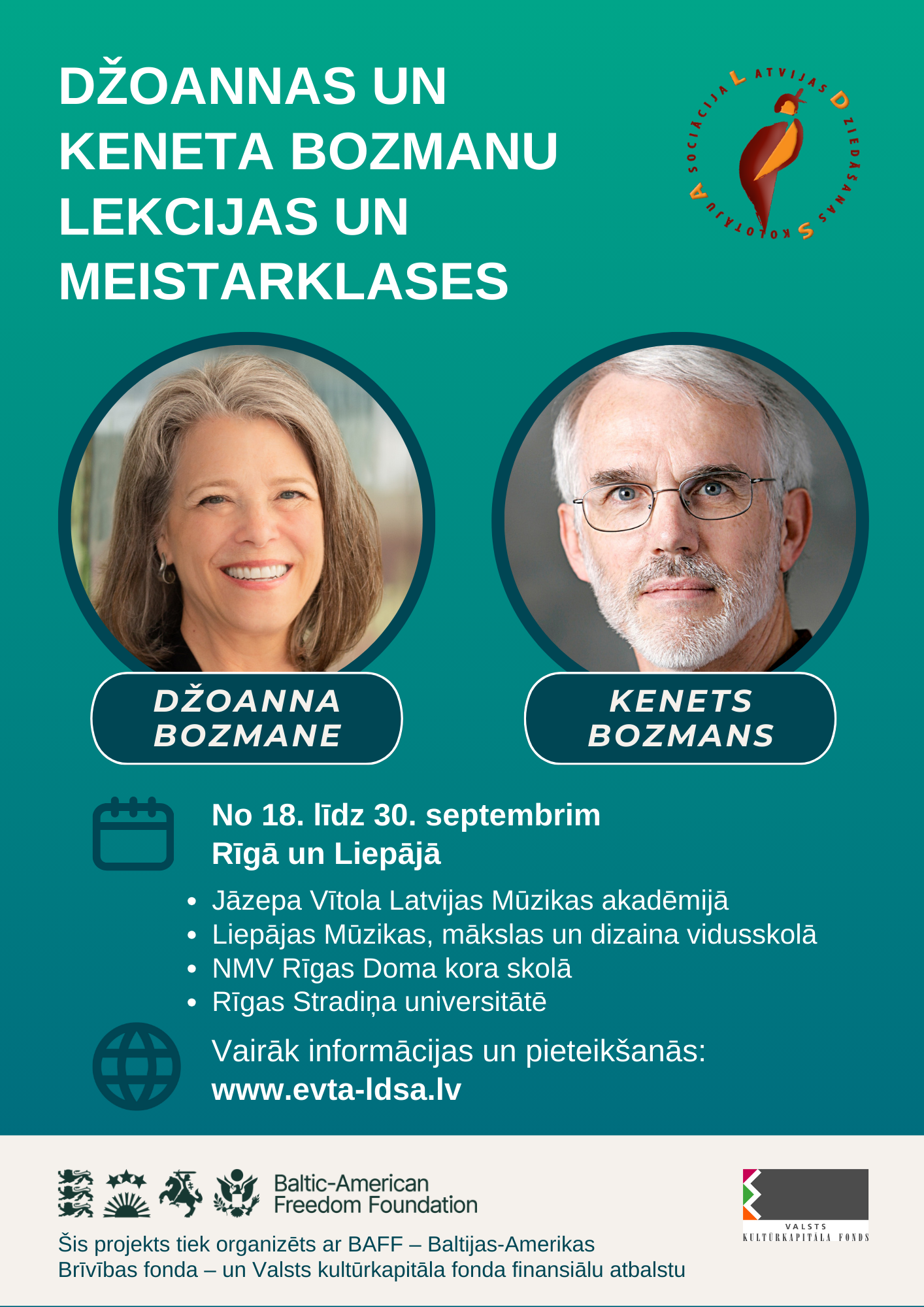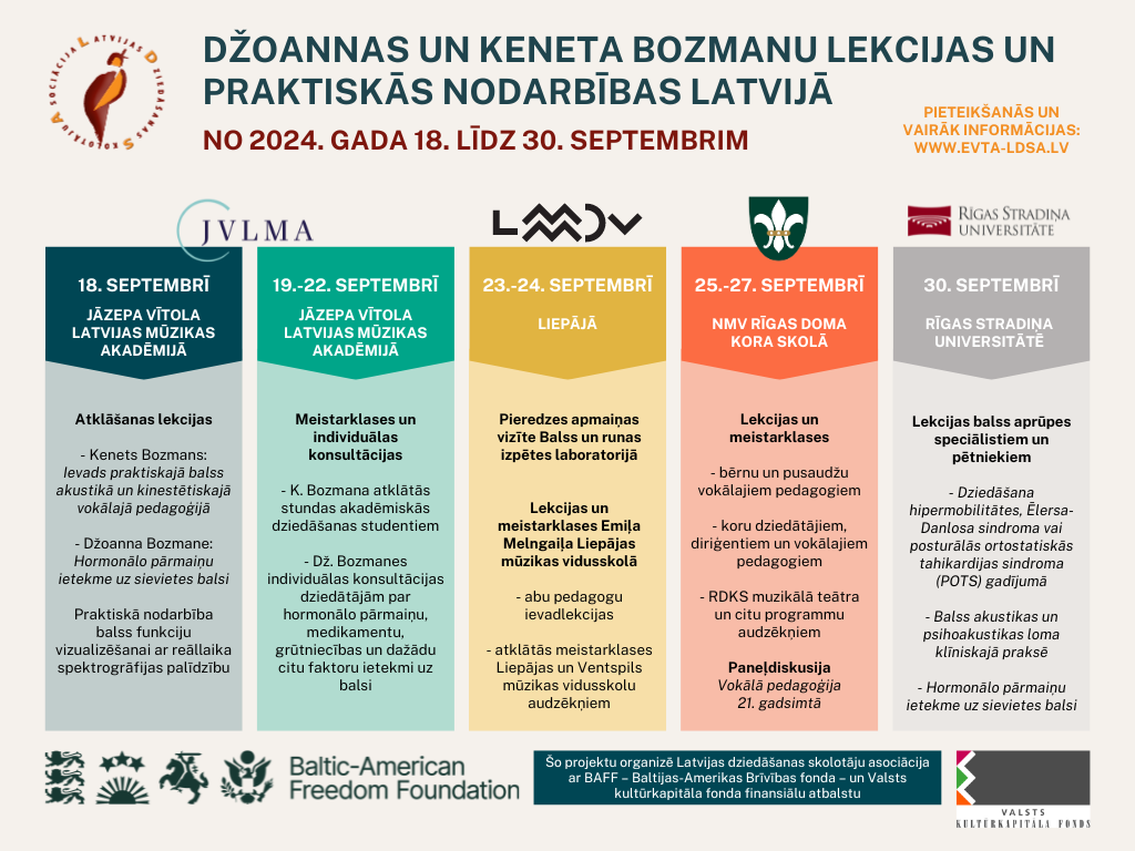 No 18. līdz 30. septembrim Latvijā viesosies pasaulē plašu atzinību guvušie balss pētnieki un pedagogi Džoanna un Kenets Bozmani (Joanne and Kenneth Bozeman), kas ar dziedātājiem, vokālajiem pedagogiem, koru diriģentiem un balss aprūpes speciālistiem dalīsies zināšanās par balss akustiku un hormonālo pārmaiņu ietekmi uz dziedātāju balsi dažādos vecumposmos.